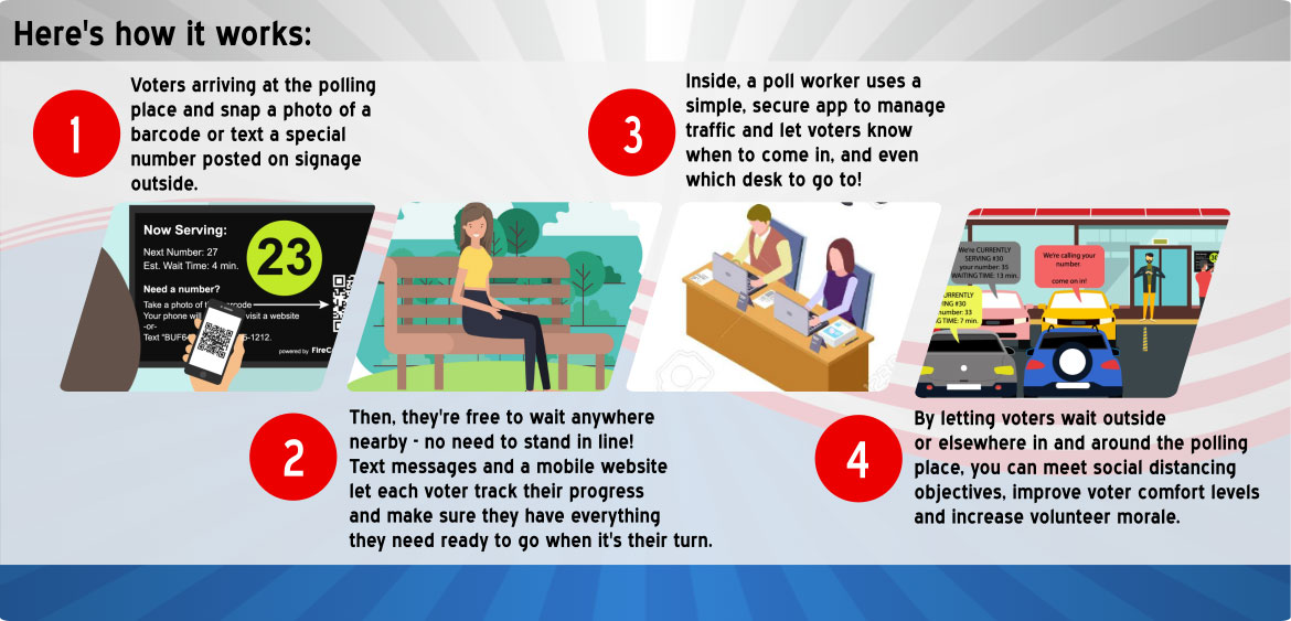 It lets voters secure and keep their place in line using their mobile phone once they've arrived on site. Once in the queue, voters can be encouraged to wait where it’s safe and comfortable. There’s no need to stand in line. The result is a safer, more satisfying voting experience.