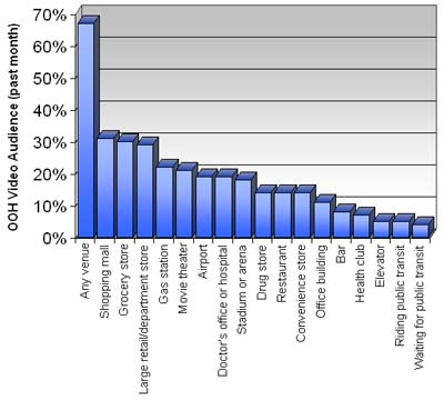 Out-of-home advertising, in its many forms, has proven to be an effective way to reach busy consumers. Instead of relying on the medium to bring the consumer to the message, advertisers use OOH campaigns to put the message in the path of consumers as they go about their day. Digital video display networks take OOH advertising to the next level. They are designed to stand out in cluttered environments and engage shoppers at the moment when the buying decision is being made. In many cases, they are the "last voice" to influence consumers before the purchase event.Arbitron and their partner Edison Research conducted interviews and read media exposure diaries from nearly 1,700 participants to come to that conclusion. In doing so, they have given us a new degree of insight into the socioeconomic and demographic characteristics of the people who see digital signage networks. Remarkably, they found that "out-of-home digital video displays as media reach two-thirds (67%) of U.S. residents aged 18 or older each month," and of those, 76% noticed them at multiple venues. That last part is really interesting to me, because it's a number that I've often wondered about, but had never seen any research on. (Since none of my own clients have screens in multiple venue types, it's been impossible getting them to pony up for research on the subject.) Whereas digital screens could once count on novelty to guarantee a certain amount of visibility, that's definitely not the case any longer -- not that any of you would have suspected it was, of course.